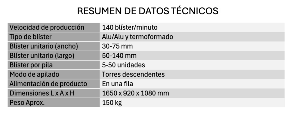 • Capacidad hasta 140 blísteres/min en torres desde 5 hasta 50 unidades.